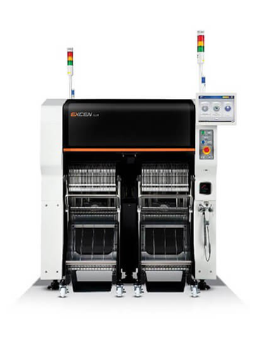 Hanwha EXCEN FLEX Pick and Place Machine is an all-in-one mounter with a dual gantry modular machine using a 12 nozzle flying camera, achieving the world’s highest placement speed of 82,000 CPH. Hanwha EXCEN FLEX, a dual gantry modular machine using a 12 nozzle flying camera, achieves the world’s highest placement speed of 82,000 CPH. In addition, it provides a One Machine Solution since it can be used for parts from 0402(01005 inch) to 140 x 55mm in size, as well as PCBs up to 900x580mm in size. EXCEN FLEX provides various production modes including mixed production of different types of PCBs, independent production at the front and rear, etc., by using a flexible conveyor system.